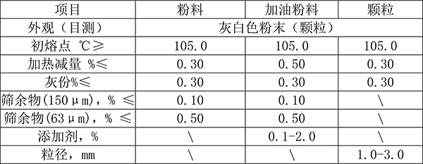 灰白色粉末(顆粒)。密度為1.26-1.32。溶于苯、氯仿、二硫化碳、丙醇、甲醇、乙醇,不溶于汽油、水、稀酸、稀堿。