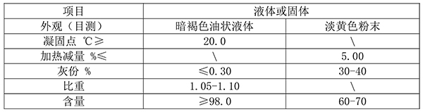 本品為暗褐色油狀液體,20.0℃以下為固體。相對密度1.05-1.10g/cm3,溶于多數有機溶劑,不溶于水。